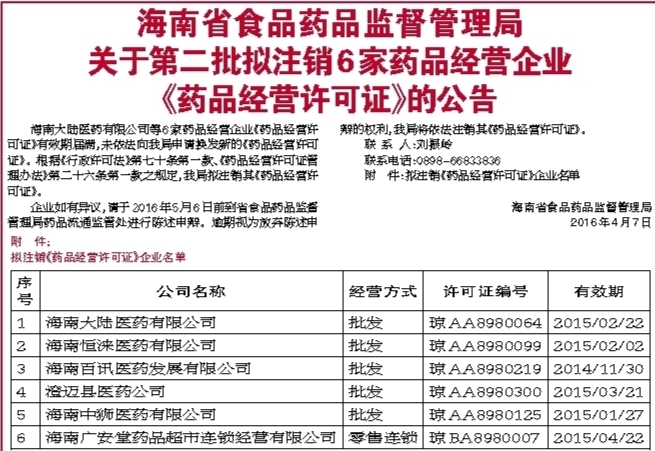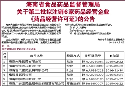海南省食品药品监督管理局关于第二批拟注销6家药品经营企业《药品经营许可证》的公告