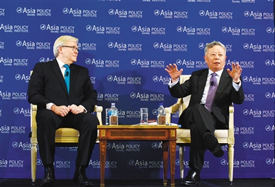 4月13日,亚洲基础设施投资银行(亚投行)行长金立群(右)和澳大利亚前总理、美国亚洲协会政策研究院院长陆克文在美国首都华盛顿出席亚洲协会政策研究所举办的活动。 金立群13日在华盛顿说,亚投行正与世界银行、亚洲开发银行就联合融资展开合作,首批项目有望于6月批准。