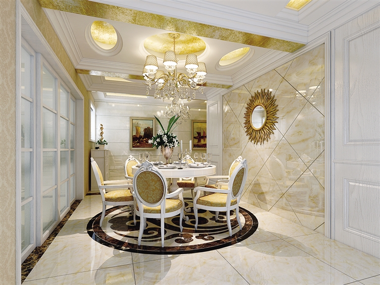 主要材料:大理石罗马柱、微晶石、金箔、软包、实木线条等