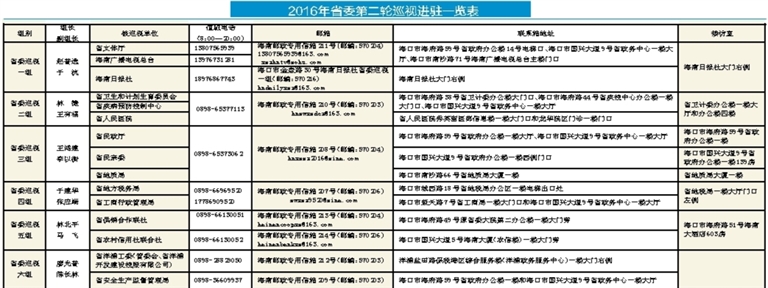 省委巡视组先后进驻了省地质局、海南日报社、省地税局、省人民医院、省供销合作联社、省安监局、省民政厅、省工商局、省农信社、省文体厅、海南广播电视总台、省洋浦工委(管委会、洋浦控股)、省卫计委、省疾控中心、省民宗委等,通报巡视的主要任务和工作安排。各单位召开动员会,省委巡视组组长就贯彻落实中央和省委关于巡视工作的指示精神、共同做好这一轮巡视工作作动员部署,省委巡视办负责同志就充分信任、坚决支持、积极配合、同步监督巡视组工作提出要求。