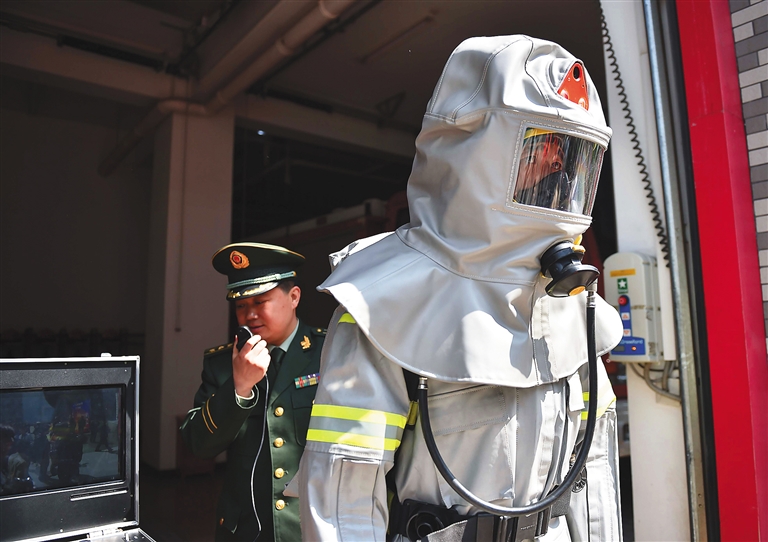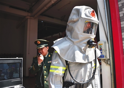 4月20日,消防战士在试用多功能消防服的通话功能。 当日,北京公安消防总队与中国航天员科研训练中心进行了多功能消防防护服交接仪式,新型防护服的成功研制使中国消防防护装备水平达到了世界先进水平,对消防官兵进行纵深突进、长时间作战提供了重要的保障支持作用。 新华社发