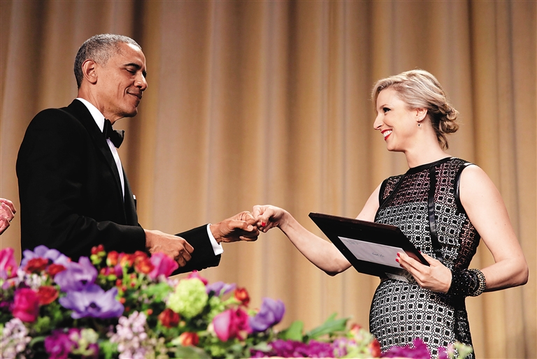 开场后不久,奥巴马就用轻松怀旧的口吻说,时间过得真快,他的任期只剩下6个月,以后就是名副其实的“跛脚鸭”了。虽然还没下台,但现在已经感觉没人待见了,访问英国时小王子都是穿着睡衣接见他,“感觉就像被人呼了一巴掌”。