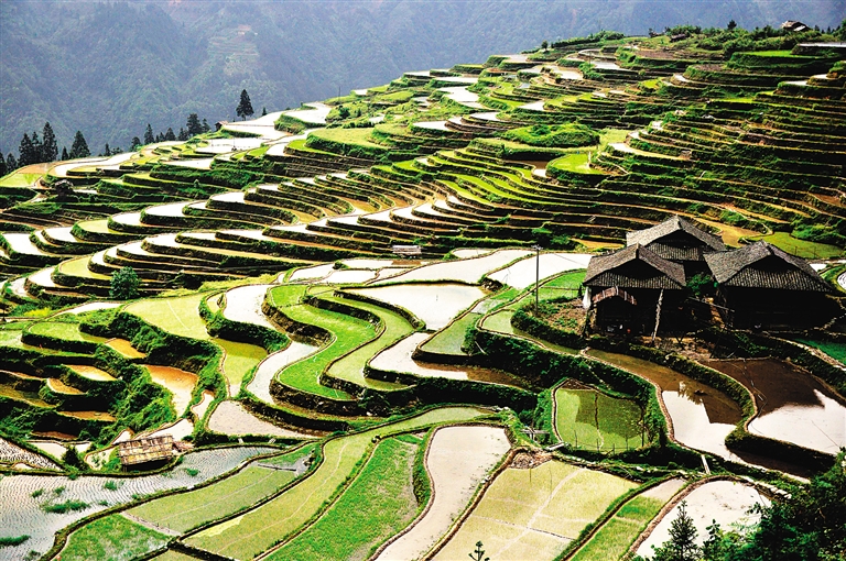 5月2日,贵州省从江县加榜乡加页村苗寨村落与梯田相互映衬。 时下,贵州省从江县山区形状各异的梯田盛满清泉,细细的田埂勾画出优美的线条,犹如水墨画一般美不胜收。 新华社发(刘朝富 摄)