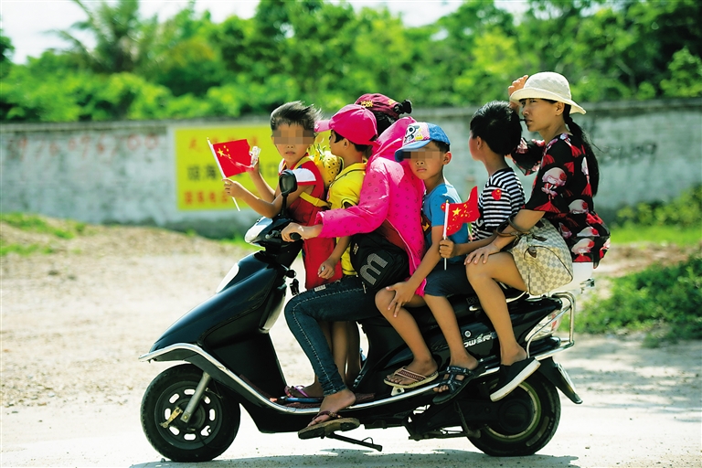 5月2日上午,在琼海市红色娘子军纪念园附近,一名妇女用电动车载着5人行驶在公路上,如此“玩命”着实令人捏了一把汗。