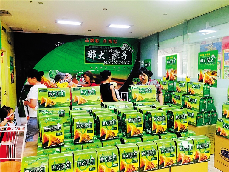 明珠广场是海口最热闹的商圈,走进负一楼的南国佳品超市,很远就能看到“那大粽子”专卖区。
