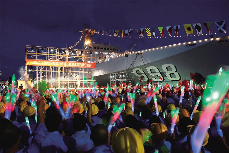 5月2日晚,海南南沙群岛永暑礁码头星光璀璨。为庆祝五一国际劳动节,海军组织海政文工团演职人员50余人奔赴南沙岛礁举行慰问演出,向驻守岛礁的官兵和建设者致以节日的问候。 新华社发