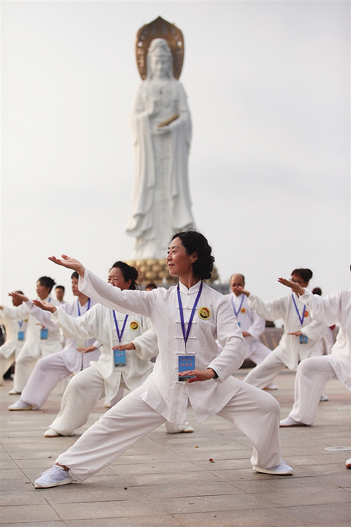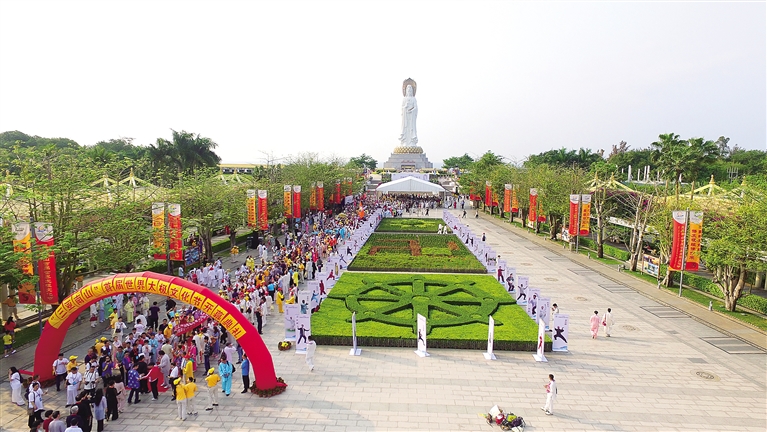 4月9日,省委常委、三亚市委书记张琦宣布“三亚南山”首届世界太极文化节开幕后,国内外100个太极拳代表队纷纷上台一展风采,引得众多中外太极拳爱好者竞相“追星”。“未来,南山将致力于推出以太极文化为深度体验的旅游产品,将太极拳的哲学思想、养生文化与南山福寿文化相融合,进一步提升景区文化品质,为三亚建设国际化热带滨海旅游精品城市增添一张闪亮的新名片。”在开幕式上,关鹏说道,三亚南山文化旅游区是国家首批5A景区,年接待海内外游客超过400万人次。2001年,南山景区成功举办“世界太极健康大会”,极大推动了三亚旅游的发展。2016年“三亚南山”首届世界太极文化节的举办,对于景区进一步丰富“寿比南山”健康内涵,助推三亚健康旅游文化产业发展以及旅游产业转型升级都具有重要意义。
