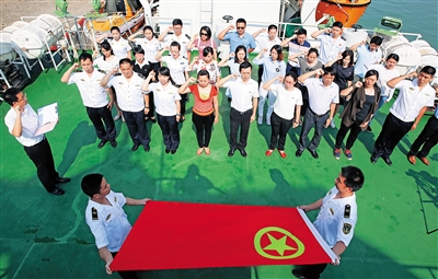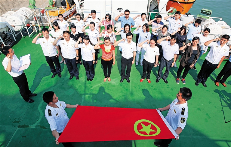 5月3日,共青团海口市委和海口海事局联合举办“携手走进海事 共话青年担当”五四主题活动,邀请来自海口市直机关单位的30多名青年代表踏上享“中国海事第一船”美誉的“海巡21”轮,并在琼州海峡海上举行升国旗仪式和重温入团誓词活动。