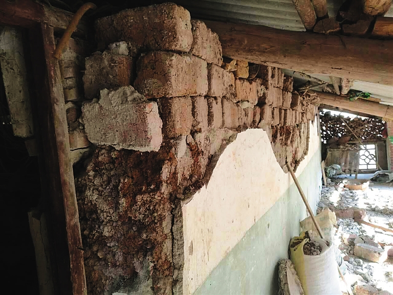 5月4日,个旧市老厂镇木登硐村委会老寨村小组一处房屋墙体受损。 据中国地震台网测定,5月4日15时51分,在云南省红河哈尼族彝族自治州个旧市(北纬23.28度,东经103.23度)发生4.6级地震,震源深度10千米;17时23分,个旧市(北纬23.27度,东经103.22度)又发生了4.7级地震,震源深度10千米。 经初步核实,目前暂无人员伤亡,但有房屋倒塌、瓦片脱落、烟囱倒落等情况,受灾情况正在进一步统计中。 新华社发(王子忠摄)