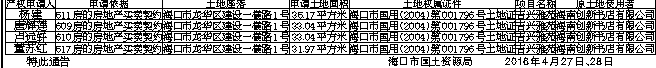 根据海南省人大常委会《关于加快积压房地产产权确认工作的决定》,现将海口市国土资源局对下述积压房地产土地确权登记申请的审核情况予以公布(详见下表)。对公布的土地使用权、所有权及他项权利有异议者,请于通告之日起60日内,以书面形式并持有关证据到海口市国土资源局龙华分局(国贸二横路国土大厦14楼)办理异议登记或复查手续。逾期没有提出异议的,即认为公布的权益无异议。联系电话:68531110