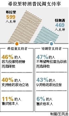 根据路透社和益普索集团5日发布的调查结果,特朗普的支持者中,大约47%表示,选择这名地产大亨的主要原因是不希望希拉里当总统;另外43%的人才是主要出于认同特朗普的政治主张;6%的人则是因为喜欢特朗普本人。