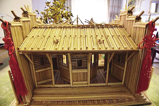 除柱子及其他少数装饰用的是竹筷或其他材料外,建筑的门窗、地板、屋脊等全都用竹签镶嵌而成。