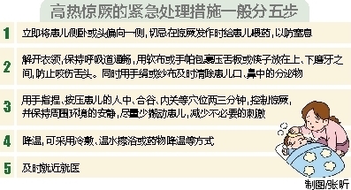 据省妇幼保健院院长向伟介绍,小孩子神经系统发育尚不完善,一旦突然高烧上了39℃,就容易出现双眼上翻、紧咬牙关、全身痉挛甚至丧失意识的症状,这就是典型的“小儿高热惊厥”。这时,如果能掌握一些关于高热惊厥的紧急处理措施(见右图表),将大有帮助。