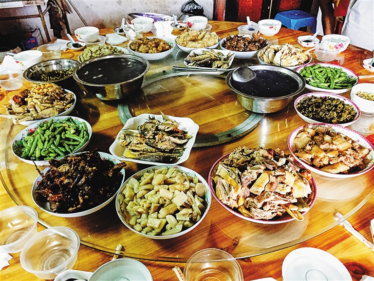 中午时分,我们来到了新民村,这是一个毗邻琼海市和屯昌县的宁静的苗村,民风淳朴,村民都很勤劳,因此生活也相对富裕。我们受邀来到一位村民家中吃午饭,主人为我们准备了一桌野鸡野鸭肉和走山的猪肉,还有地里的田鼠、山笋及野菜,满满地摆了一大桌,这些菜肴,虽谈不上什么厨艺,却也是最丰盛的情谊了。在一间采光并不太好的厨房里,人们围拢而坐,每个人面前摆着一个盛满液体的大碗,在大雨拍打瓦片的声响中,我人生中第一次的苗家午宴开始了。