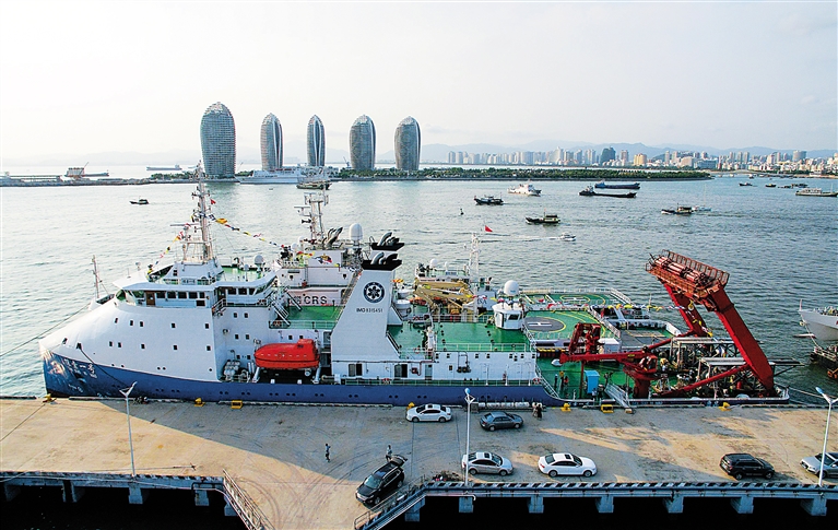 5月10日,停泊在三亚母港的“探索一号”。“探索一号”是我国首艘4500米载人潜水器及万米深潜作业的工作母船, 目前在三亚母港安装海底地震探测系统设备,计划近期驶往太平洋马里亚纳海沟执行科考任务。本报记者 武威 摄