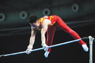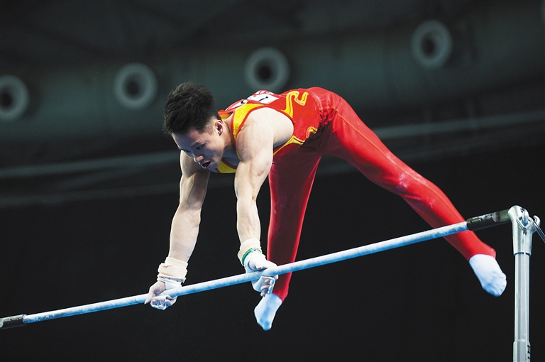 5月11日,2016年全国体操锦标赛暨里约奥运会选拔赛在安徽合肥体育中心体育馆开赛。在男子团体比赛中,贵州队以353.850分获得冠军。图为贵州队选手刘榕冰在单杠比赛中。 新华社发