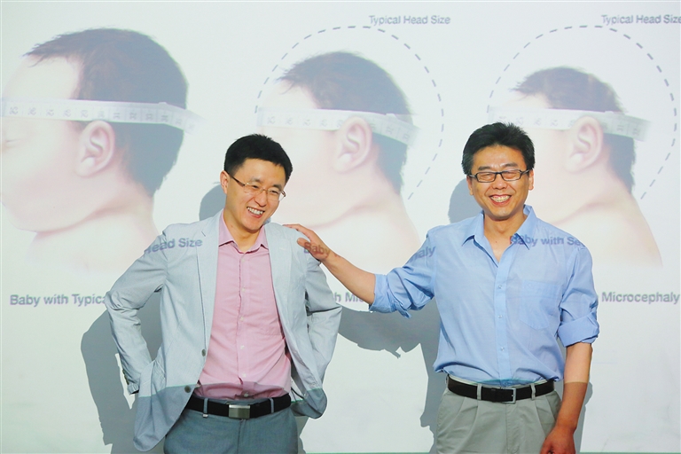 5月11日,在北京中国科学院遗传与发育生物学研究所,许执恒研究员(右)与秦成峰教授在对媒体讲解寨卡病毒感染直接导致小头畸形的研究成果后合影留念。 新华社记者 才扬 摄