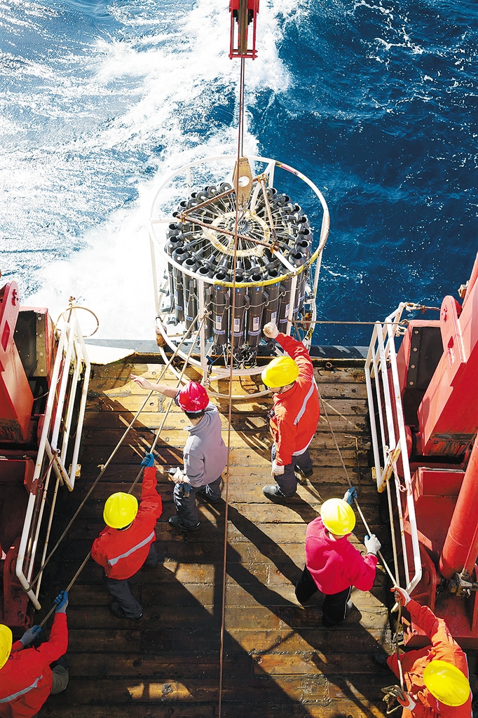 5月12日,科考队员在后甲板将CTD系统投放入水。当日,正在执行中国大洋40航次第四航段科考任务的“向阳红10”科考船在西南印度洋工作区域投放CTD系统至2000米左右的海底,获取了不同深度的温度和盐度数据及海水样品。 新华社发