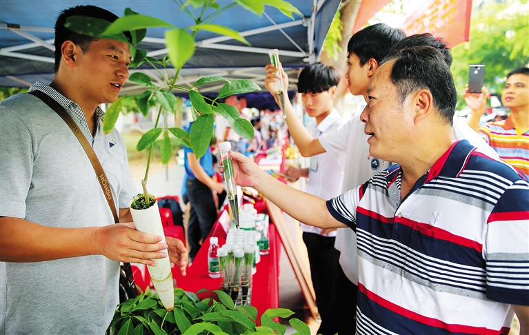 5月12日,中国农业科学院研究人员向群众推介开发组培的热研7-33-97橡胶组培苗。当日,儋州第十二届科技活动月启动,许多科研创新成果从实验室走出来,向当地群众展示,让群众了解、共享。本报记者 苏晓杰 摄