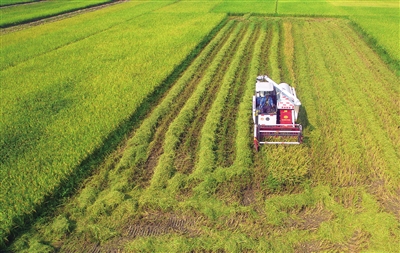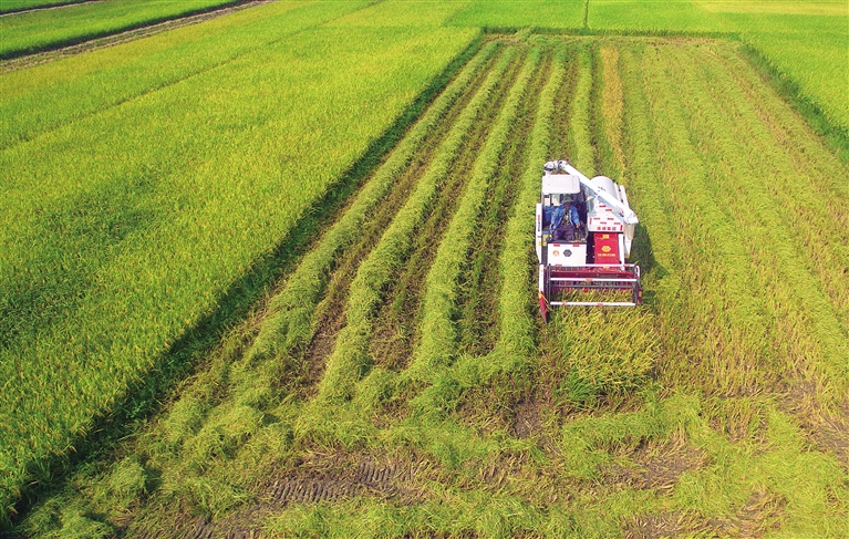 5月11日,琼海博鳌镇培兰村的群众在抢收早稻。