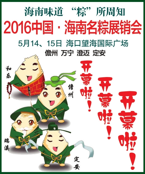 本报海口5月13日讯 (记者刘梦晓)2016海南名粽展销会将于14日在海口望海国际广场拉开帷幕,儋州、万宁、澄迈、定安四个市县共46家粽子企业参展,不仅有多样美味的粽子,各市县展馆也尽显地方特色。