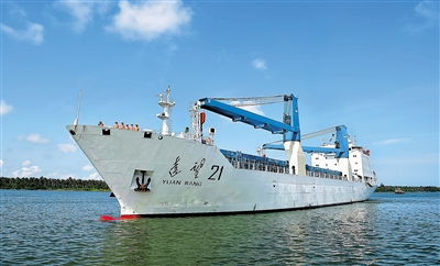 5月8日上午,远望21号从天津港装船起航,经过6昼夜海上航行,途经渤海、黄海、东海、台湾海峡、南海等海域,安全抵达海南文昌清澜港码头,总航程约1670海里。