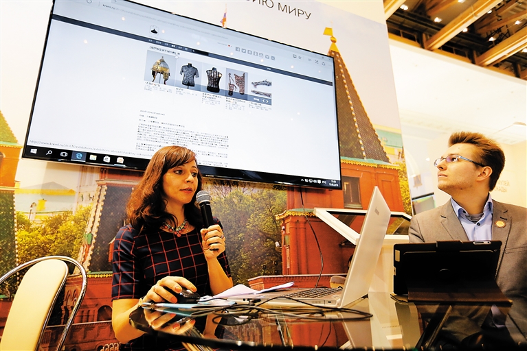 5月13日,在俄罗斯首都莫斯科,莫斯科克里姆林宫博物馆网站负责人尤利娅·卡扎良(左)在推介会上发言。 莫斯科克里姆林宫博物馆中文网站推介会13日在莫斯科举行。中文版网站包括“博物馆”、“访客”、“展览”、“教育”等页面。此外,中文版网站还推出了关于莫斯科克里姆林宫的主题网页,观众可进行虚拟游览,了解俄罗斯丰富的历史文化遗产。 新华社发