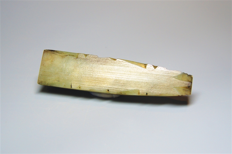海南藏家张先生收藏的汉代玉蝉就是一件典型的“汉八刀”作品。此玉蝉长7.5cm,宽3cm,玉质温润细腻,油性重,光气足。器型扁平,中间略厚,蝉头部双目向外凸出,正面翼翅长而窄,翼肩斜弧平缓,顶端两眼斜凸于两侧,颈部斜磨出一道半月形凹痕,双翅宽大并合拢,紧贴蝉背,翅长身短,背部光素,在双眼同敛翅的刻工上都应用了“八分相背法”。玉蝉整体造型简洁明快,刀工犀利干净,头部有一对穿孔,以供佩系之用。