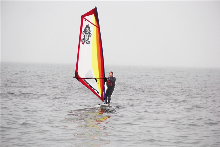 刮风、浓雾、微雨,但阎浩依然在海上练习着帆板。“这种天气不算什么,大浪、大风才有挑战性。”他说。