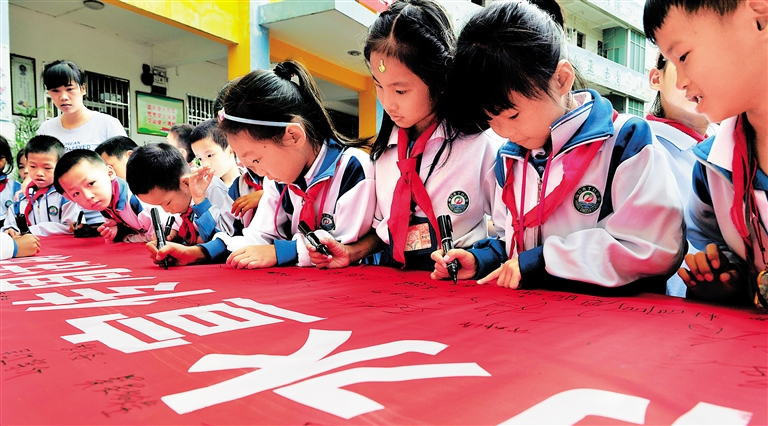 5月16日上午,由海口市水资源管理中心主办的“坚持节水优先 建设海绵城市”2016年全国城市节水宣传周活动在海口市丁村小学举行。孩子们在校园里的节约用水宣传条幅上踊跃签名,积极加入到节约用水行动中。本报记者 古月 摄