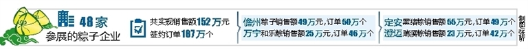 为期2天的“2016中国·海南名粽展销会”落幕了,成果丰硕。据不完全统计,仅展销会活动期间,48家参展的粽子企业共实现销售额152万元,签约订单187万个,其中,儋州粽子销售额49万元,订单50万个;万宁和乐粽销售额25万元,订单数量46万个;定安黑猪粽销售额55万元,订单49万个;澄迈瑞溪粽销售额23万元,订单42万个。