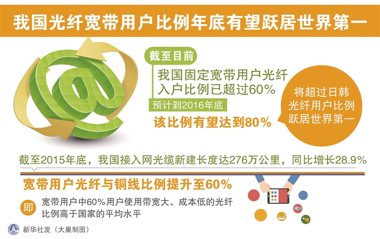 据介绍,截至2015年底,我国接入网光缆新建长度达276万公里,同比增长近三成,光纤长度够围地球赤道绕69圈。
