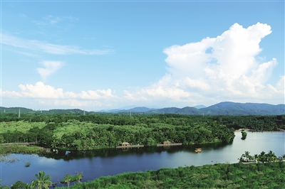 夕阳西下,如意拱桥的倒影映在湖面上,湖面波光粼粼,大队伍和小分队组成的白鹭方阵,分批分次由南向北贴着湖面飞翔、盘旋,然后降落在湖心的灌木、芦苇间,白茫茫的一片,给这个浓绿的世界点缀出一片柔软的纯色。清澈的风吹过,身后的棕榈树枝叶摇摆,远处的沙排场上有人们的欢笑,栈道上有散步的老人和悠闲的垂钓者,从北方长途奔袭而来的房车整齐排列着,车旁摆着简易的厨具,沸腾的锅里飘出鸡汤的香气,每一个细节都透着令人安心的气息。站在中国负氧离子最高的湖畔,我是最幸福的人。