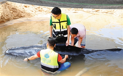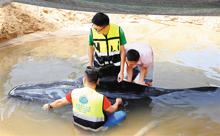 据富力地产相关人员介绍,该公司保安人员昨晚10时45分在巡逻沙滩时发现了搁浅的鲸鱼,于是连夜守护,并联系公司旗下的海洋主题公园的海洋生物专家等前来救助。