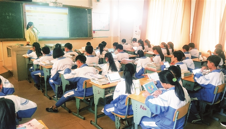 这是昌江黎族自治县思源实验学校九(1)班一节普通英语课上的一幕。黎族女孩唐巧慧以及她的所有同学,都在平板电脑上做英语练习。