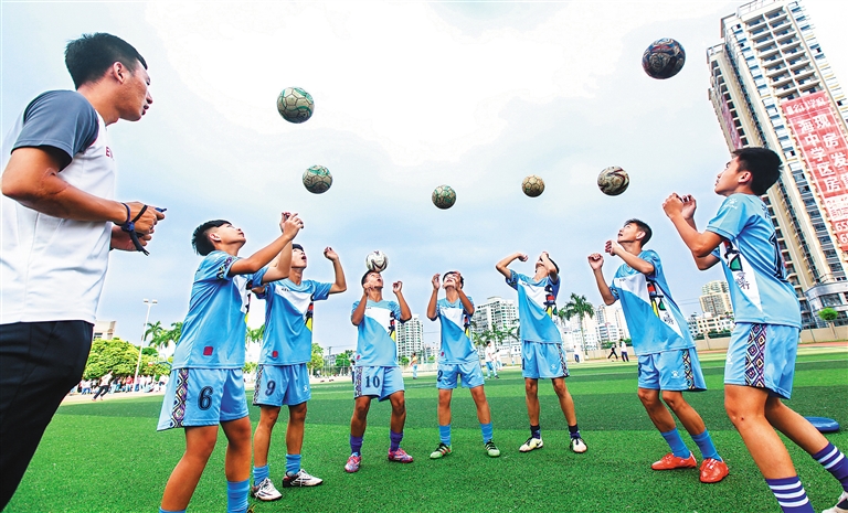 5月16日,在海南中学操场,来自恒大足球俱乐部的教练在指导学生训练。据了解,自去年以来,我省遴选出包括海南中学在内的121所全省青少年校园足球特色学校,加强入选学校校园足球的师资配备和经费投入。