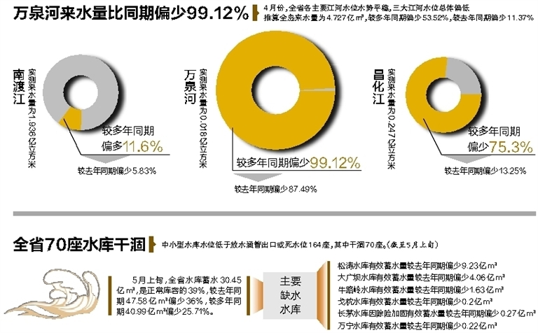 今年2月到4月我省降雨量偏少,较常年同期偏少30%-50%,加之4月中旬出现大范围高温天气过程,导致水库、江河水量较少。截至5月上旬,全省水库蓄水30.45亿立方米,是正常库容的39%,其中,164座水位低于放水涵管出口或死水位的中小型水库中,干涸的有70座。