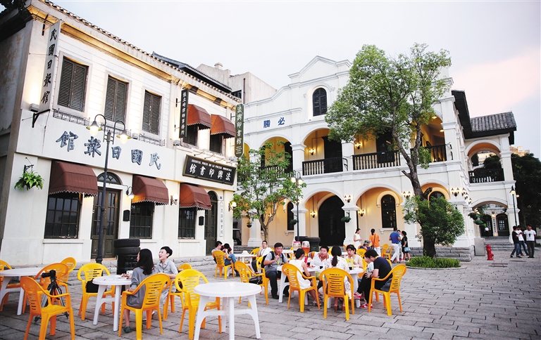 5月19日,在海口观澜湖华谊冯小刚电影公社钟楼广场举行全民夜游狂欢派对,活动包括电影公社“民国夜市”烧烤美食、灯光秀、精彩音乐演出等。图为游客在广场惬意地小憩。本报记者 张茂 摄
