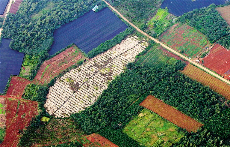 航拍海南某地的一片园地,造型酷似大鞋印的图案出现其中,请大家猜猜这是哪里?