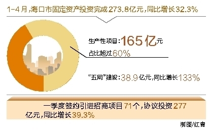 去年以来,海口坚持早谋划项目,抢抓省里重大部署,谋划和储备项目,为稳增长蓄能增势。建起“十三五”项目库,谋划储备260个重点项目、总投资达9000多亿元。为吸引新项目,海口积极出台政策扶持引导,先后研究制定旅游、互联网、房地产、文体教育等产业政策,为招商引资创造条件。一季度签约引进招商项目71个,协议投资277亿元,同比增长39.3%。