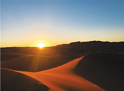 此时哈桑已经开始早祷,我也爬上沙脊准备看日出。太阳没有任何悬念地在清晨6点左右从远处的沙丘后面一点一点弹出来,金色的阳光染亮了我们每个人的脸庞。