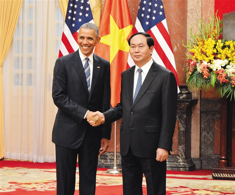 越南国家主席陈大光当天为奥巴马举行欢迎仪式,并与奥巴马举行会谈。
