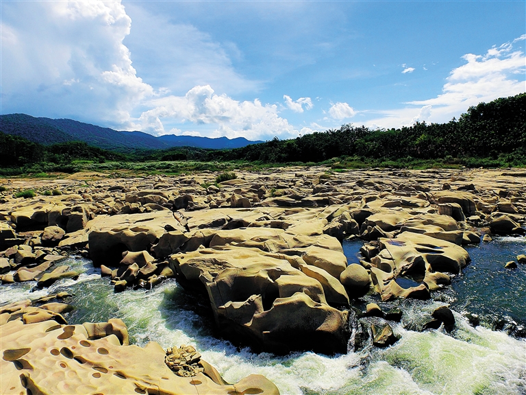 沿着河滩继续向下行进,淙淙流水声不绝于耳,与密林中的蝉噪、鸟鸣交织成一首动人的自然乐章。途中不时可见巨大的沉积岩石壁,如刀劈斧削,有些突兀而出,可供路人遮阳避雨。