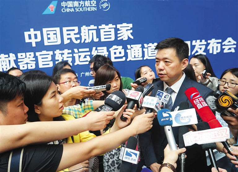 5月24日,在广州举行的南航开通人体捐献器官转运绿色通道新闻发布会上,南航股份公司总经理助理李军接受媒体采访。 当日,中国南方航空公司公布该公司保障人体捐献器官顺利转运的机制,这是5月6日国家卫计委等六部门联合下发《关于建立人体捐献器官转运绿色通道的通知》后,国内首家民航企业开通人体捐献器官转运绿色通道。 新华社发