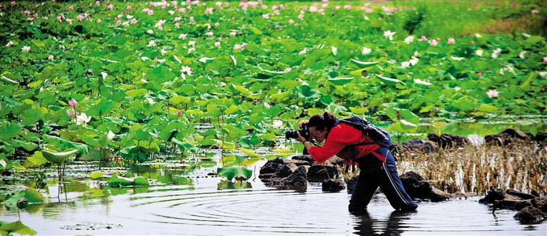 与泉眼旁火山岩的黑形成鲜明对比,荷叶的绿、荷花的艳,在阳光下更显得娇艳欲滴。早在两年前,村民们便用火山岩在泉眼旁简单堆砌起了游泳池,免费供游人纳凉享用。“大自然的馈赠,怎好意思用金钱来衡量?”当地人的淳朴,真好似莲花品性。