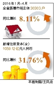 行政权力的减法,有效地激发了市场活力。2016年1月-4月,全省新增市场主体30303户,同比增长8.11%;新增注册资本(金)1059.12亿元人民币,同比增长31.76%。其中,企业10410户,同比增长16.33%,新增注册资本(金) 1045.11亿元人民币,同比增长32.34%。2016年4月,现代物流产业企业数量同比增长125%,注册资本金同比增长了790%,金融保险业企业数量同比增长84.21%,注册资本金增长了84.21%。旅游产业的企业数量增长了32.35%,注册资本金同比增长416.91%。