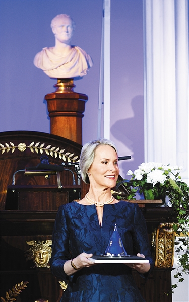 5月24日,在芬兰赫尔辛基,美国生物化学家弗朗西斯·阿诺德手捧“千年技术奖”奖杯。 新华社/法新