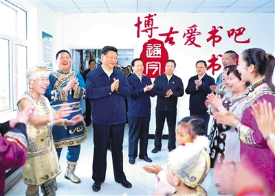 接着,习近平参观了赫哲族民俗展,观看了属于国家级非物质文化遗产的赫哲族伊玛堪说唱教学。他赞扬赫哲族历史悠久、文化丰富,特别是渔猎技能高超、图案艺术精美、伊玛堪说唱很有韵味。