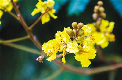 左图为塔岭新区绽放的花朵引来蜜蜂采蜜。通讯员 黄祥 摄