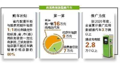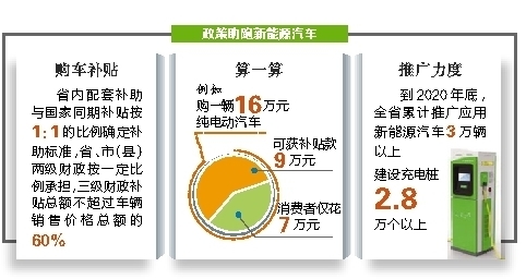 此次出台的《实施意见》中,我省明确提出以纯电驱动为新能源汽车发展的主要取向,以公共服务领域的新能源汽车推广应用为切入点,积极鼓励个人购买使用新能源汽车。到2020年底,全省累计推广应用新能源汽车3万辆以上,建设充电桩2.8万个以上。
